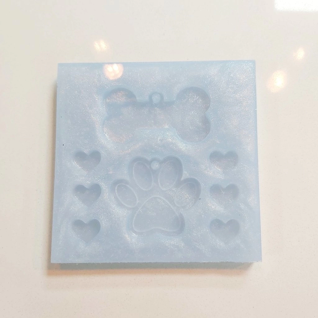 Dimensões finais das peças em resina: Ossinho 5,5 x 3 cm 4,6 x 3,8 e Patinha 5,3 x 3 cm com Mini Corações.